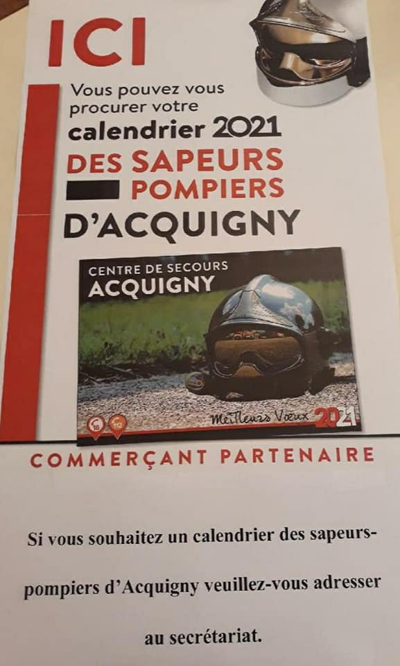 Le démarchage à domicile n’étant pas autorisé, vous pouvez retrouver le calendrier des sapeurs pompiers d’Acquigny dans tous les commerces de notre commune ainsi qu’à la mairie.